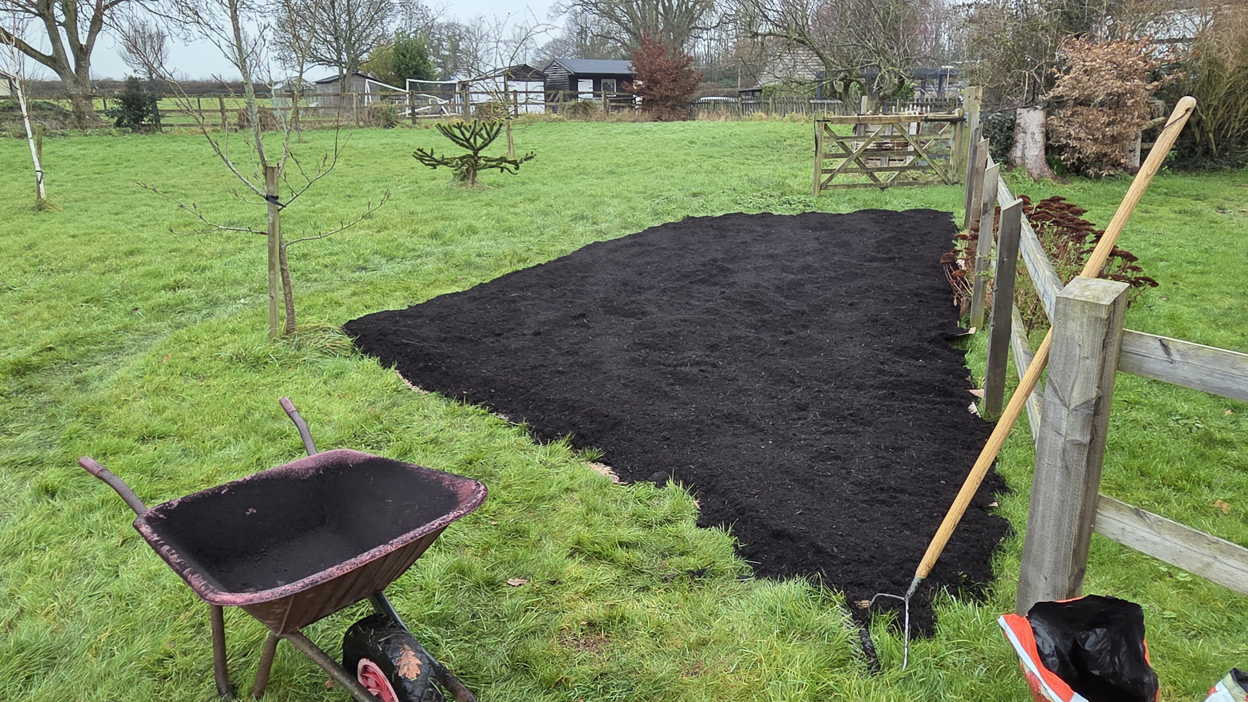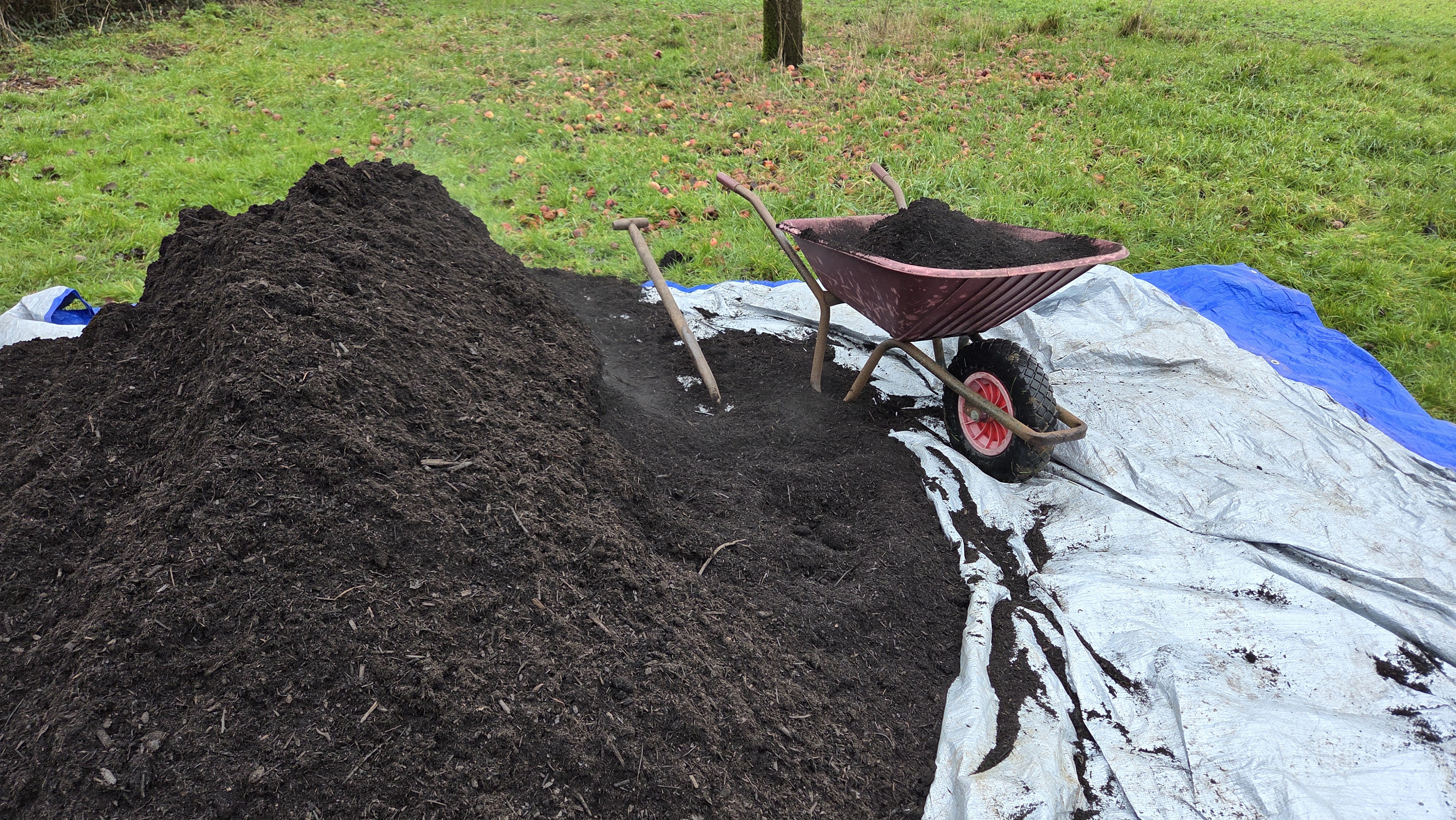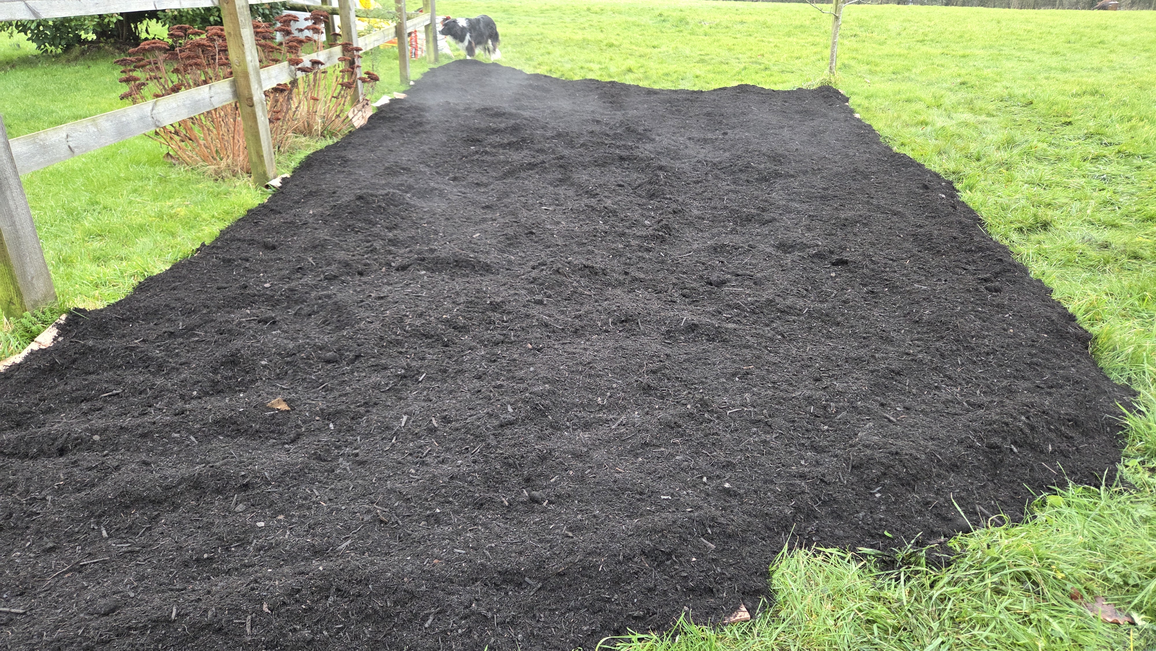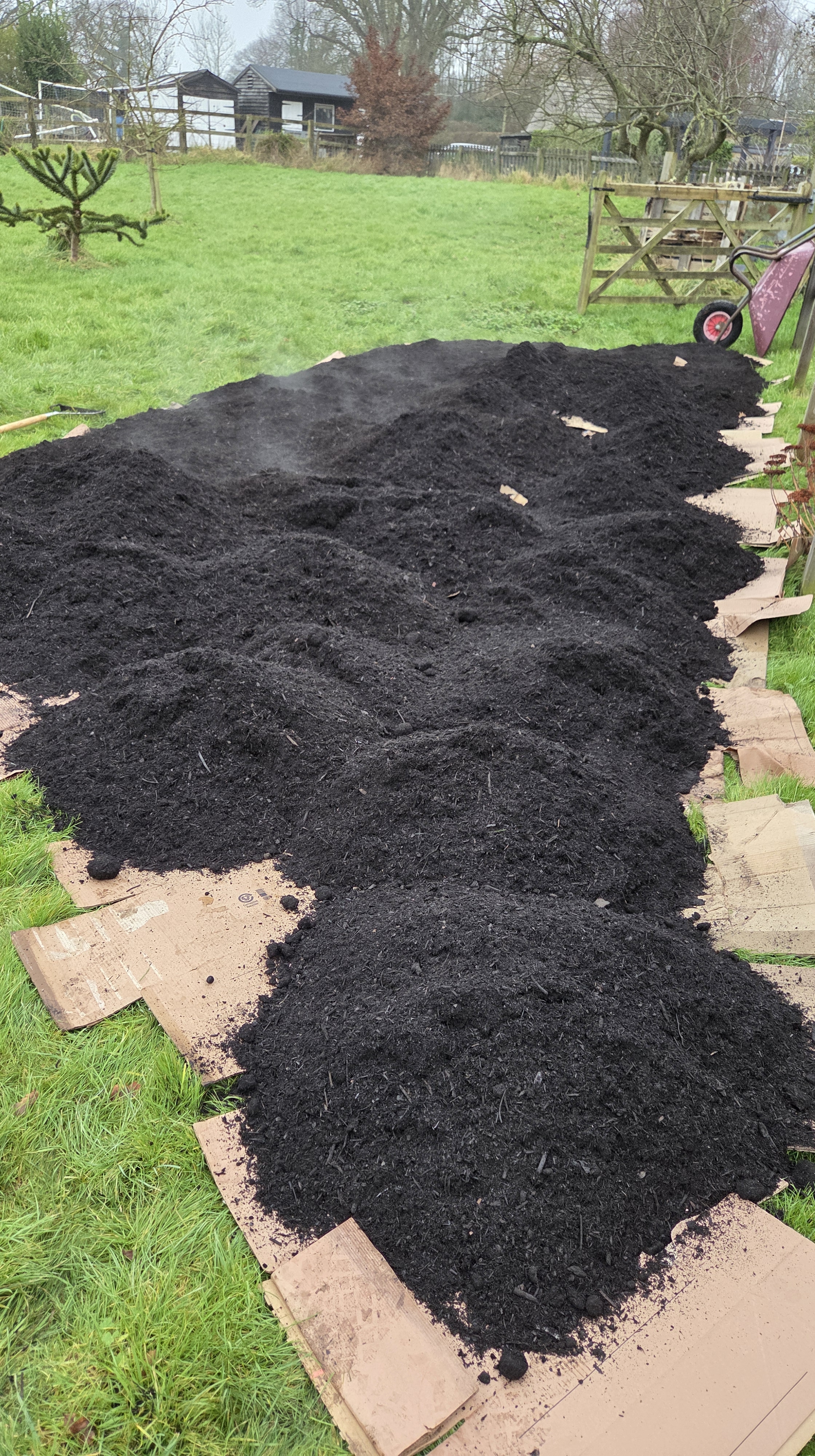 The territory has no rare earth minerals, oil or gas, so we had to bring our own raw materials and natural resources in the shape of two tons of Revive Soil Conditioner, expertly delivered by Kevin (Wally) Watson to Garden Gate HQ. It was still hot and smokin’ as we shovelled thirty-one barrowloads of the black stuff to cover the cardboard mulching. Unlike the proverbial horse shit being spewed in Davos this week, we have ordered a trailer load of the real thing, so our beds will soon be well made and ready for planting.