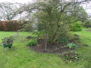 I never would have thought that I would find this therapeutic, but I am genuinely gaining immense satisfaction from the back straining labour. When I was younger this would have been anathema to me, but not now, and the reasons are complex. Before Easter I set out to clear the “Silver Wedding” bed (so-called as it was created from herbaceous gifts given to my parents when they celebrated 25 years together). Now while I agree with Pippa that digging is very therapeutic, it also struck me that, while I found the clearing of ground and revelation of spring plants satisfying, I think that it goes deeper than that, to a sense of territoriality. What I am really doing is laying claim to that piece of turf – taking away my father’s influence, if not ownership.