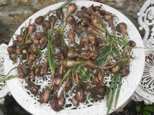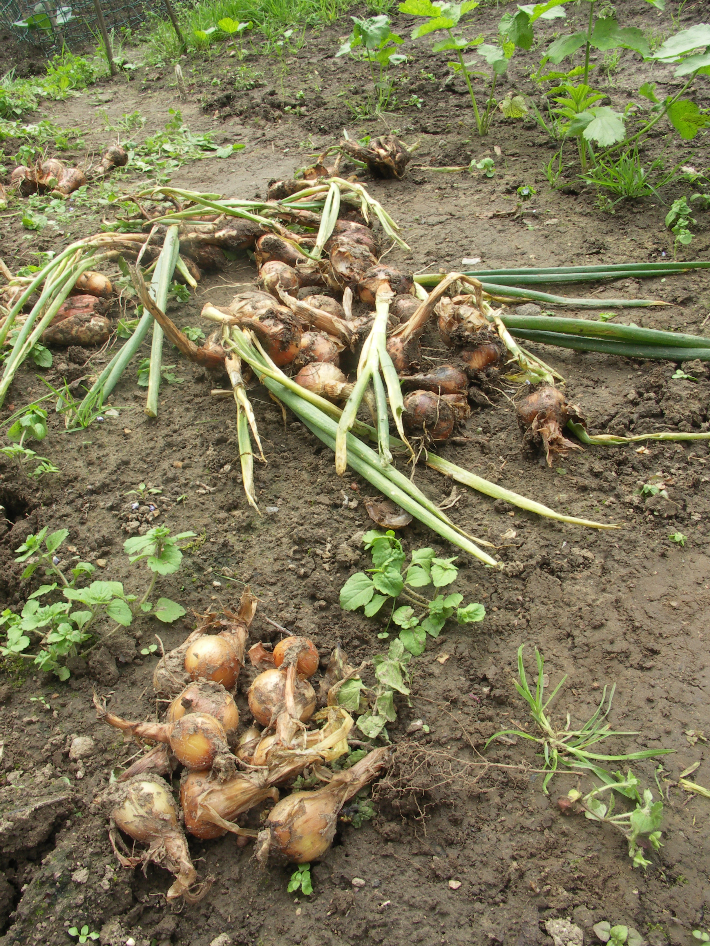 A final note on my previous post about labelling things. I decided to lift the shallots, which I did under the supervision of T.O.M. It was all going well, with him advising which were “banana” shallots and which the ordinary variety (pretty obvious really – no need for labels there) when I found one little clump which had not developed greatly. We simultaneously realised that this was not a clump of underprivileged shallots, but was a garlic bulb. How did that get there? I wondered. Then remembered that all the shallots and garlic had been put in hurriedly at the start of the spring. So, once agin, you need to be so careful to label things, you know.