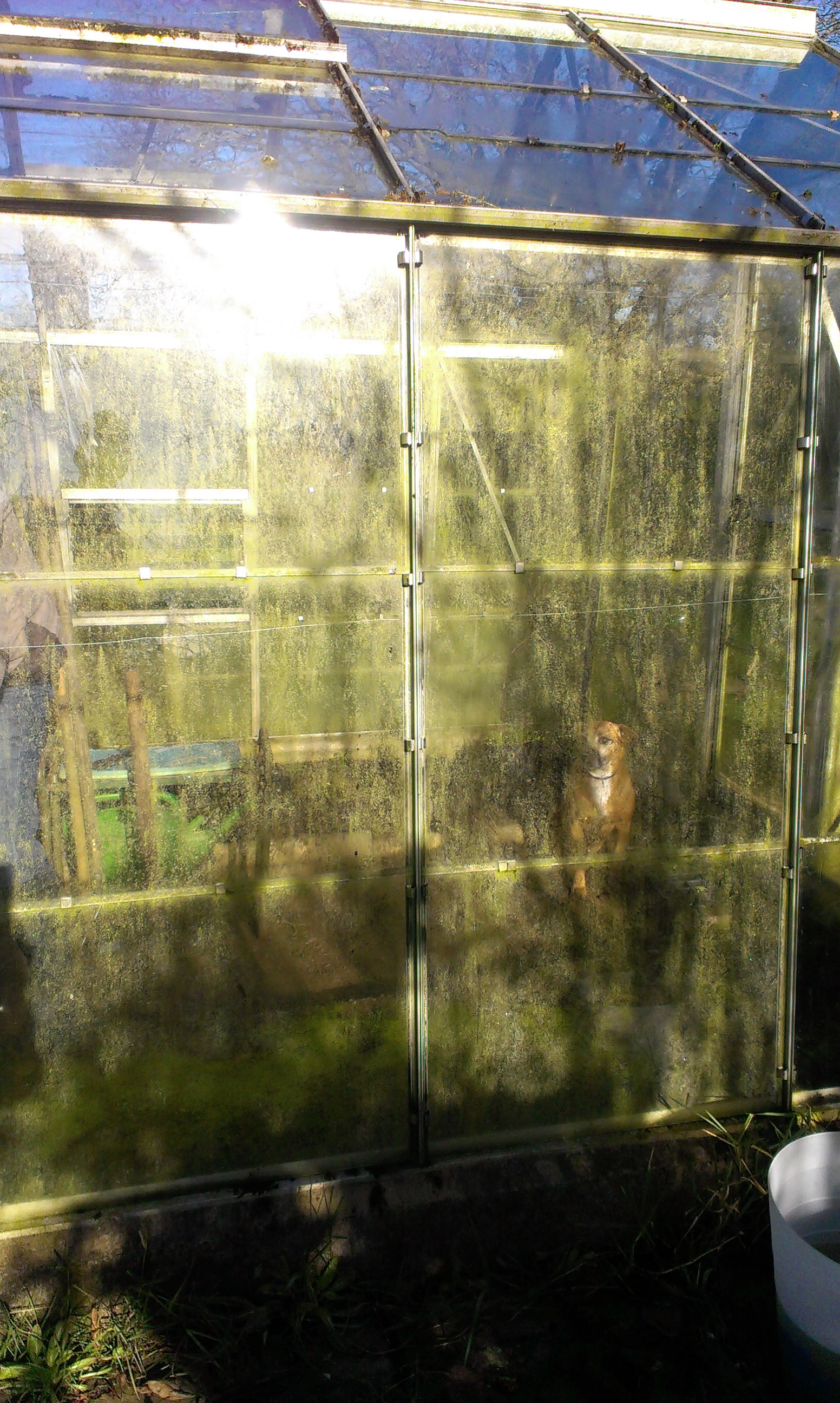 This time last year, Claire was in hospital undergoing her final chemotherapy and stem cell transplant, so even going out and scrubbing down a load of glass seems like a treat – particularly as only six months ago she might not have had the energy to contemplate it. Last year Lynn very kindly washed the greenhouse, so this was my first attempt at an early spring clean in the garden. It was no big deal, but only when you get up close and personal to it to do you see why Greenhouse is not a misnomer for a shed made of glass: Fungus the Bogeyman would not have felt out of place in this moldy residence. So I did the outside, Claire wiped the inside and the results speak for themselves.