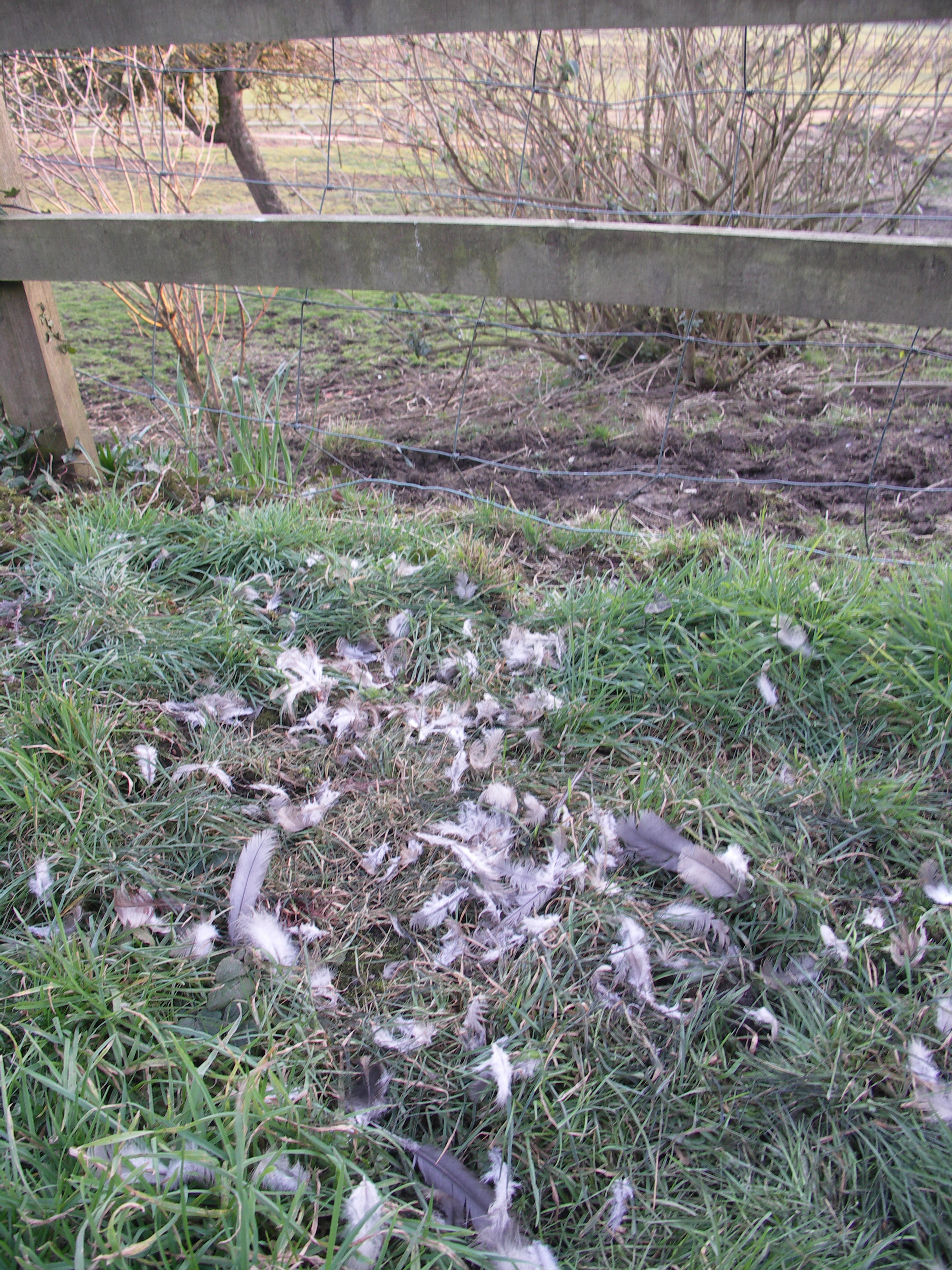 So a quick trawl on the internet, locate the place we got the others from, phone the farm, and hey presto the next day Claire returns home with three new hens – identical to the three casualties whom Mr Fox had taken (why Mr? Could be Mrs , you know). In the meantime I had discoveed evidence of one hen’s demise on the other side of the lane from us. Claire did the forensic analysis and pronounced Bluebell a gonner. The other two were officially listed as Missing in Action – presumed to be Fox Fodder.