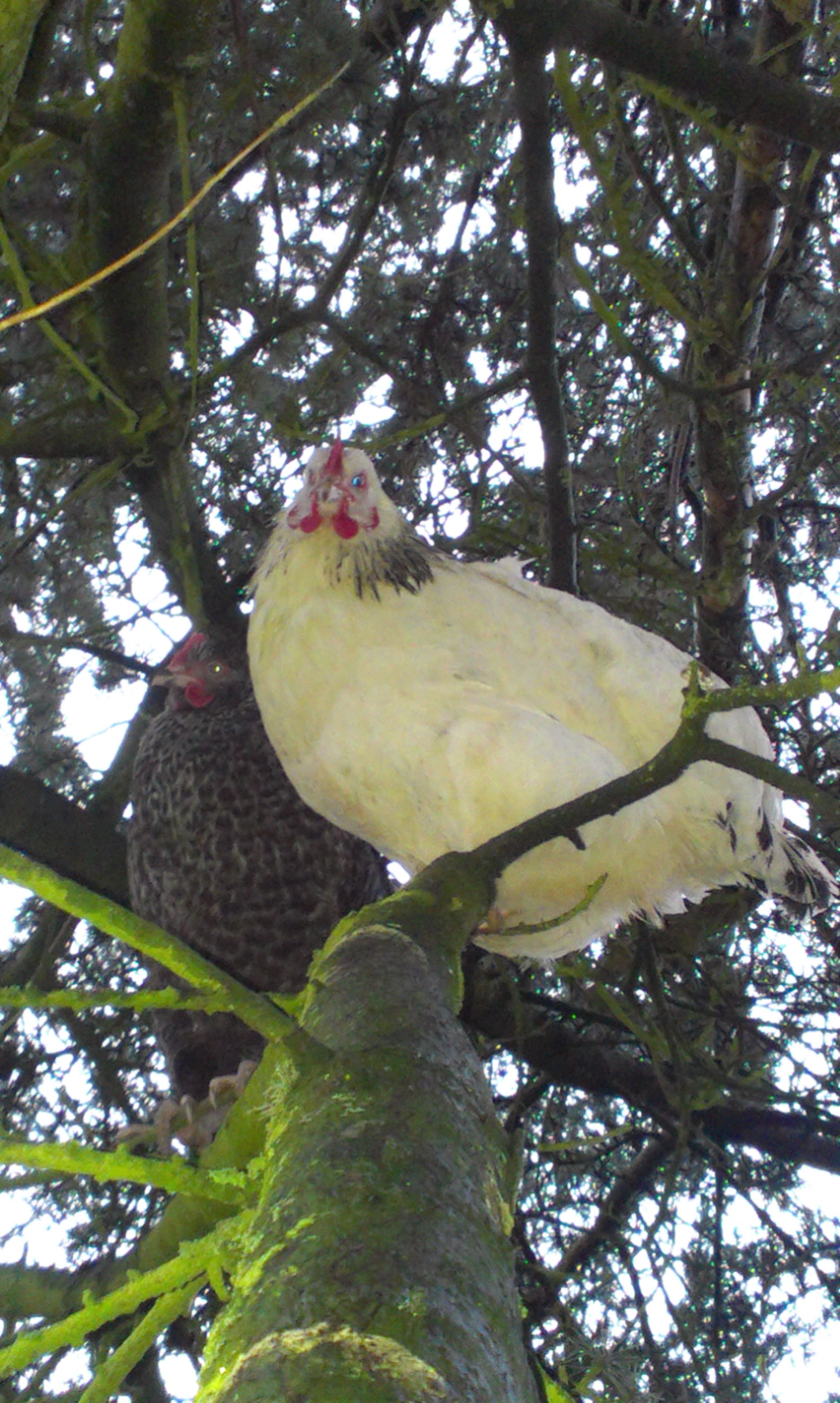 So this morning – in the dry and relative warmth (my car says plus 5) I have managed to shore up the fencing, mend holes and extend the high wire to ensure all six can get on well enough. That said the pecking order is undoubtedly in favour of older ladies who happily hunkered down in the hen-house last night while the newcomers decided that “no – honestly – we are very happy to roost in this tree”. So there they still were in the tree this morning looking a little scared of heights (or just the three bullies below).