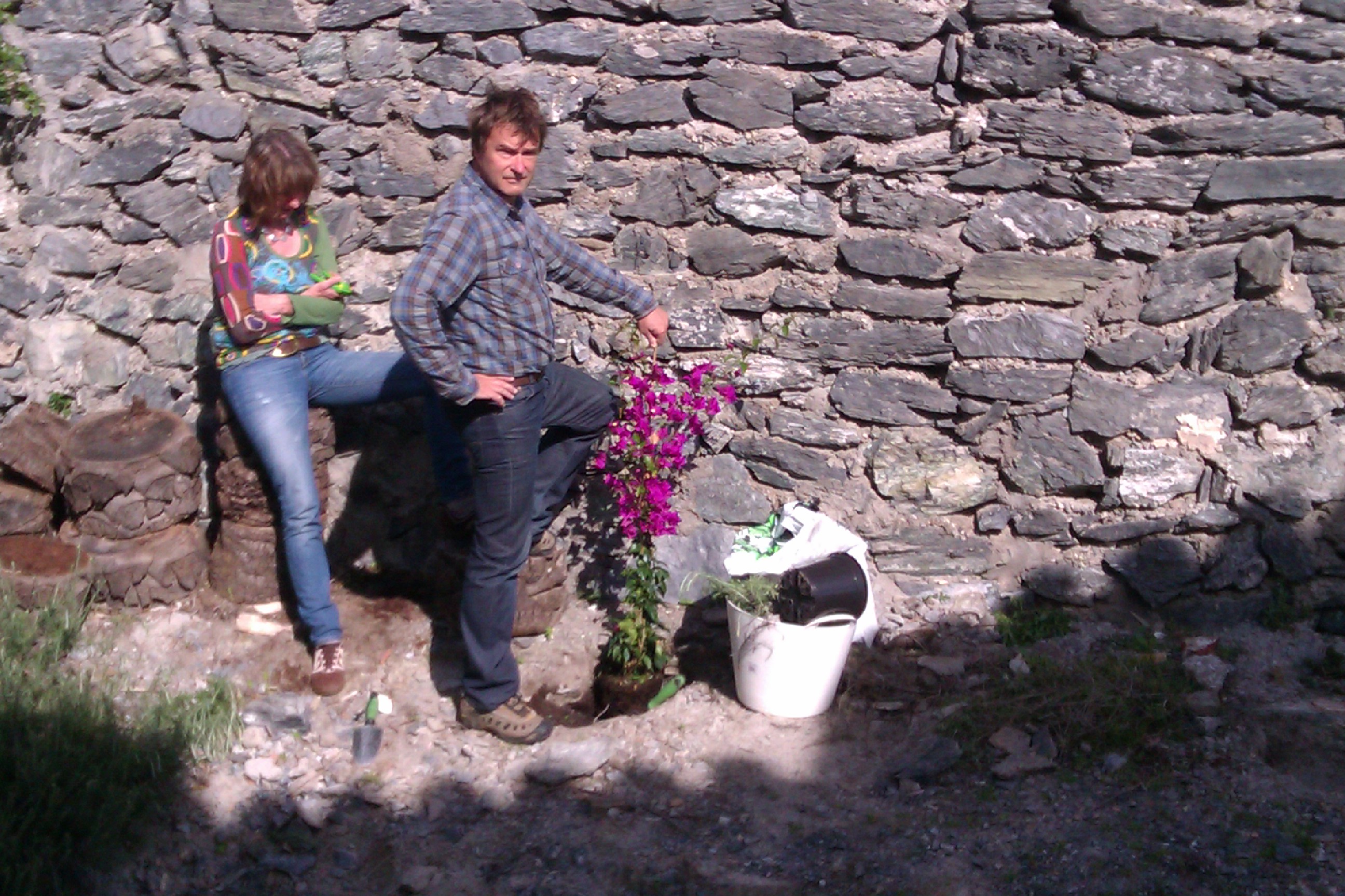 Paul, meanwhile, has bought geraniums for the window box and a Bougainvillea from the market, which he managed to simply plant straight into his part of the vertiginous back lot as he miraculously found a small spot of soil. He has other flowers along the back bought from the market. There might not be too many plants in hs back garden, but then again, there are not always that many in these semi arid zones – just ask my dad (or rather make some comment within his earshot and he will tell you without being asked).