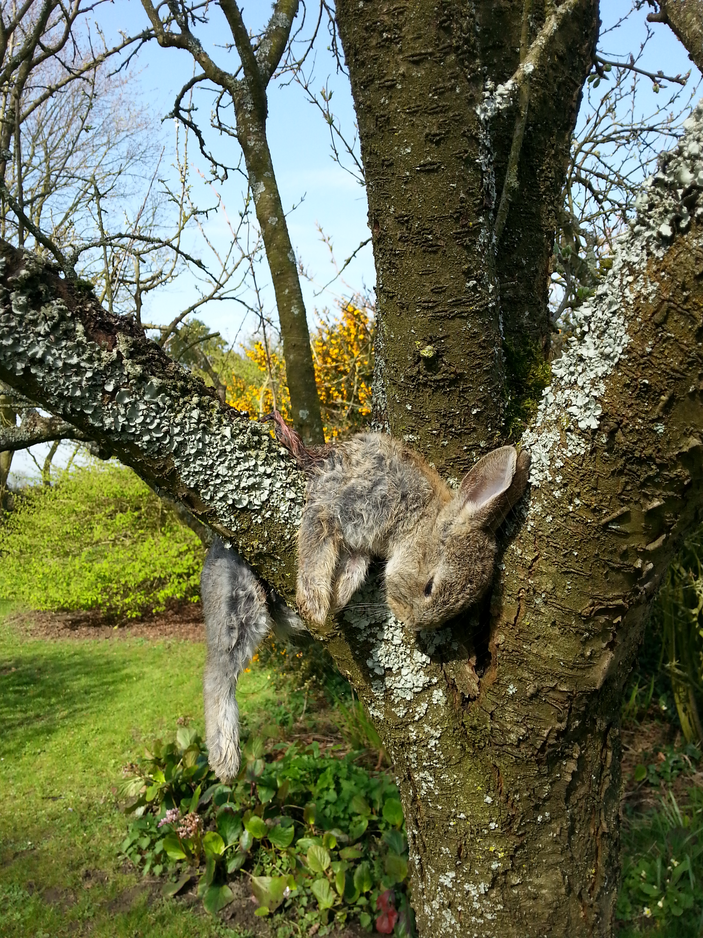 her) as she came back to the house. I took my nervous labrador down the garden, only to discover the rabbit had disappeared. There was no doubt it WAS dead, but, well, you know, it being Easter and all, was there a chance that this rabbit had risen again? With no sign of any stone being rolled away and with the only apparent witness to the miracle being a dumb labrador, we are left to surmise on possible explanations. The best I could come up with – other than a new Lapine messiah or a rabbit zombie – was that Ella had been spooked by a bird of prey taking the rabbit from the cross. Tree. I think a buzzard rising from the plum tree would be enough to scare most puppies.