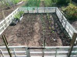 Well, with a little help from Josh I was able to clear the main veg patches. In the interests of low maintenance I have this year put a large amount of cardboard over the open areas to keep the weeds down. On top of this I spread compost from the field . It all looks reasonably tidy now although getting enough cardboard was the main challenge. But passing the electrical store in Cary just before recycling I was able to collect several TVs’ worth of packing which did the job. I also unpacked a couple of box loads of promotional shopping bags from the bookshop which had been water damaged when they arrived some months ago and had been sitting in the garage ever since. (It’s funny how “stuff” just accumulates isn’t it?). So the garden now resembles a landfill site with the “Books Are My Bag” legend dotted around the edge in some bizarre sponsorship deal. But there ain’t too many weeds.