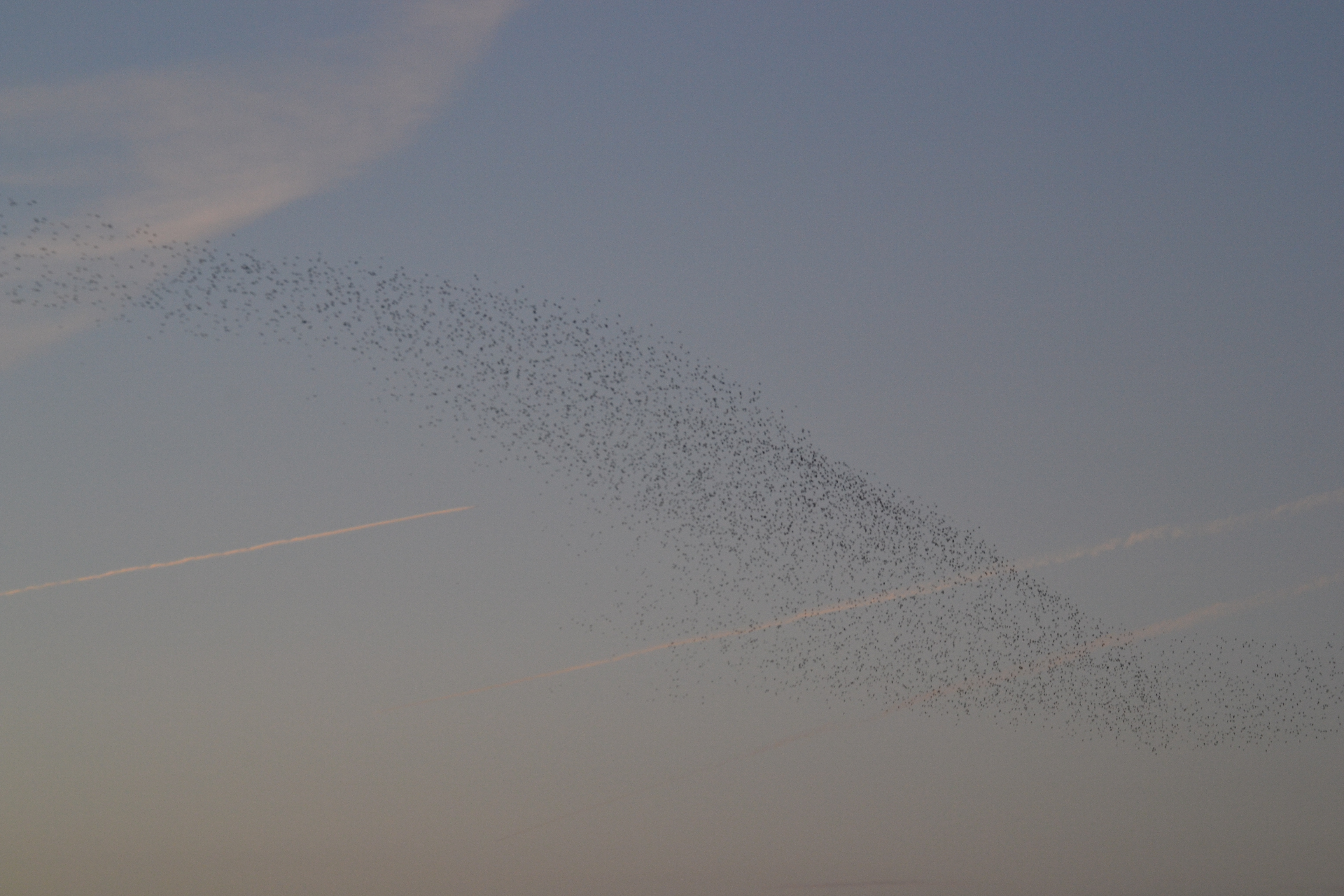 Starlings against a backdrop of vapour trails