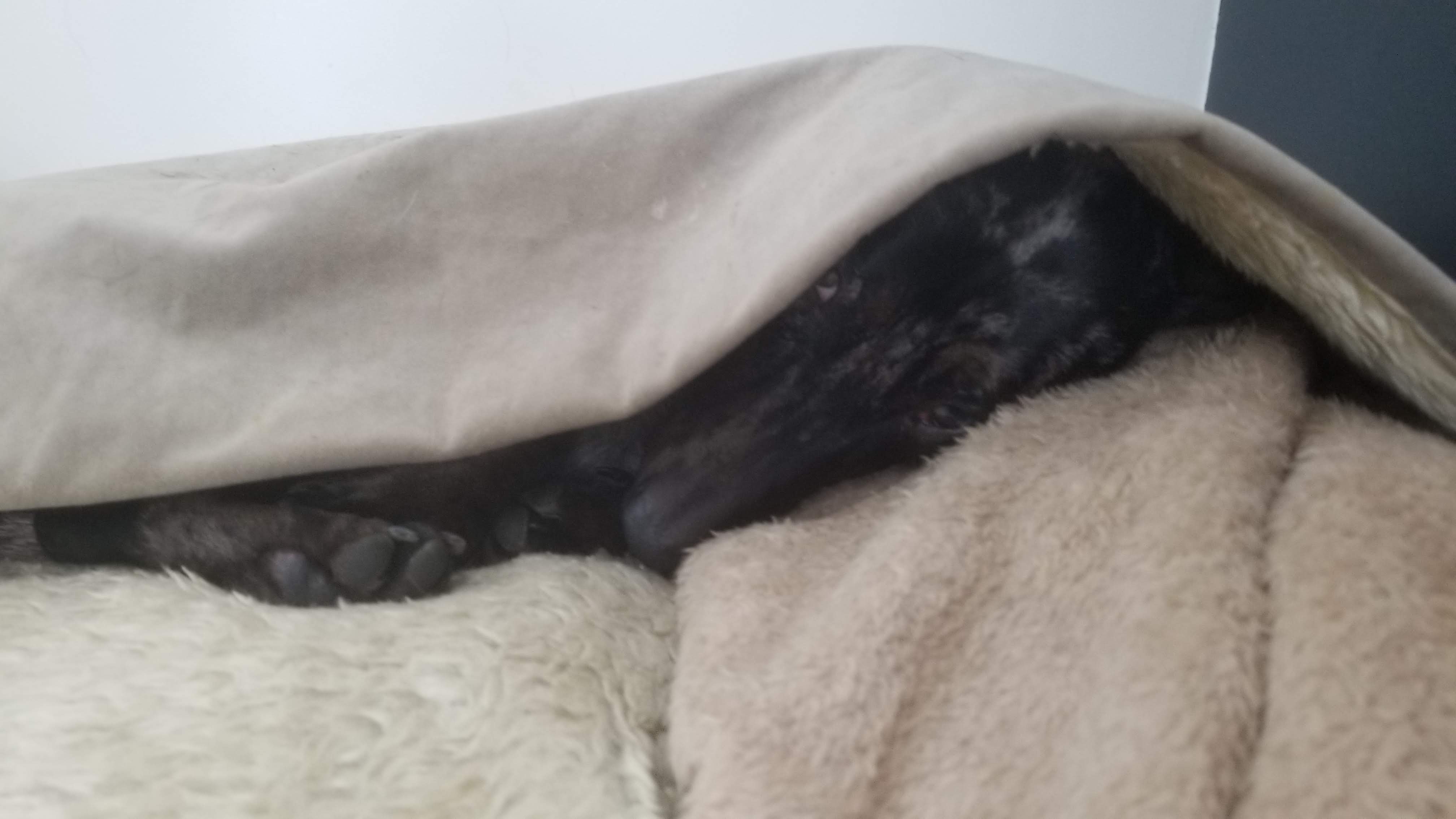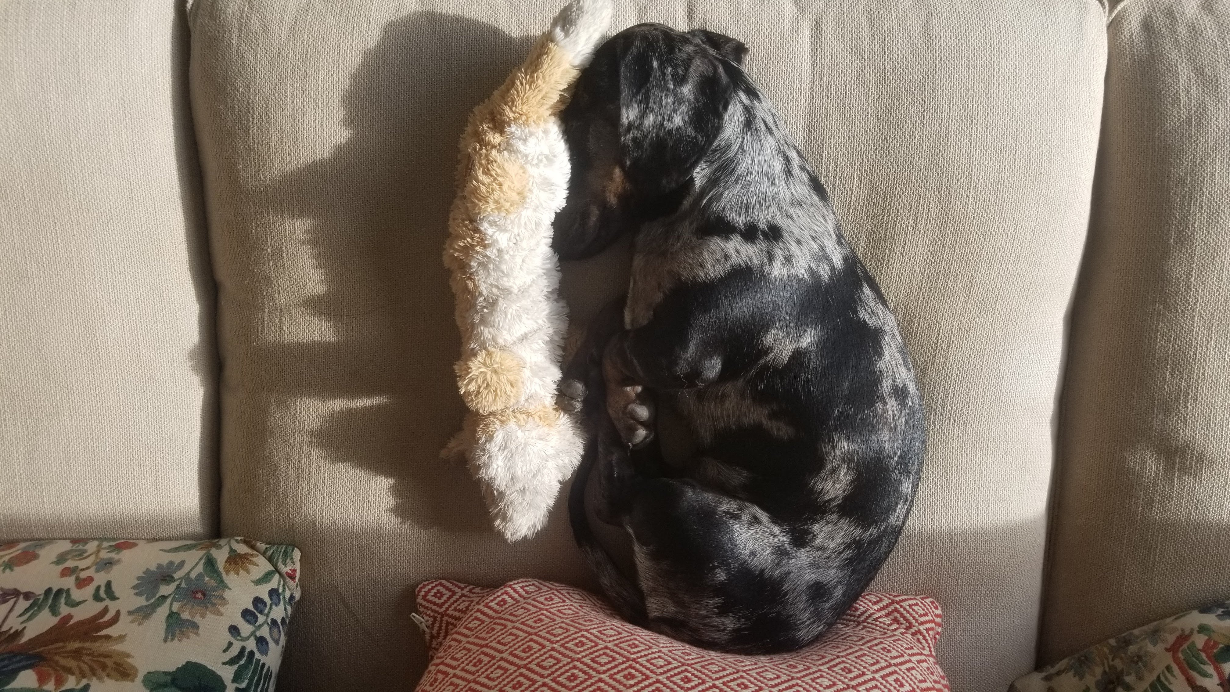 But that was one night in a busy pub / hotel (with other dogs). He were sure he would be fine at my brother’s house, when we visited earlier this year. And I am sure he would have been, if it was not for the gourmet feast of mozzarella, chorizo and cherry tomatoes that The Long Dog took advantage of when it was generously left for him on a low coffee table. By the time he was discovered, he was metaphorically wiping the plate with the remains of a large home-baked sour dough loaf. His subsequent whining and restlessness throughout the night we put down to indigestion.