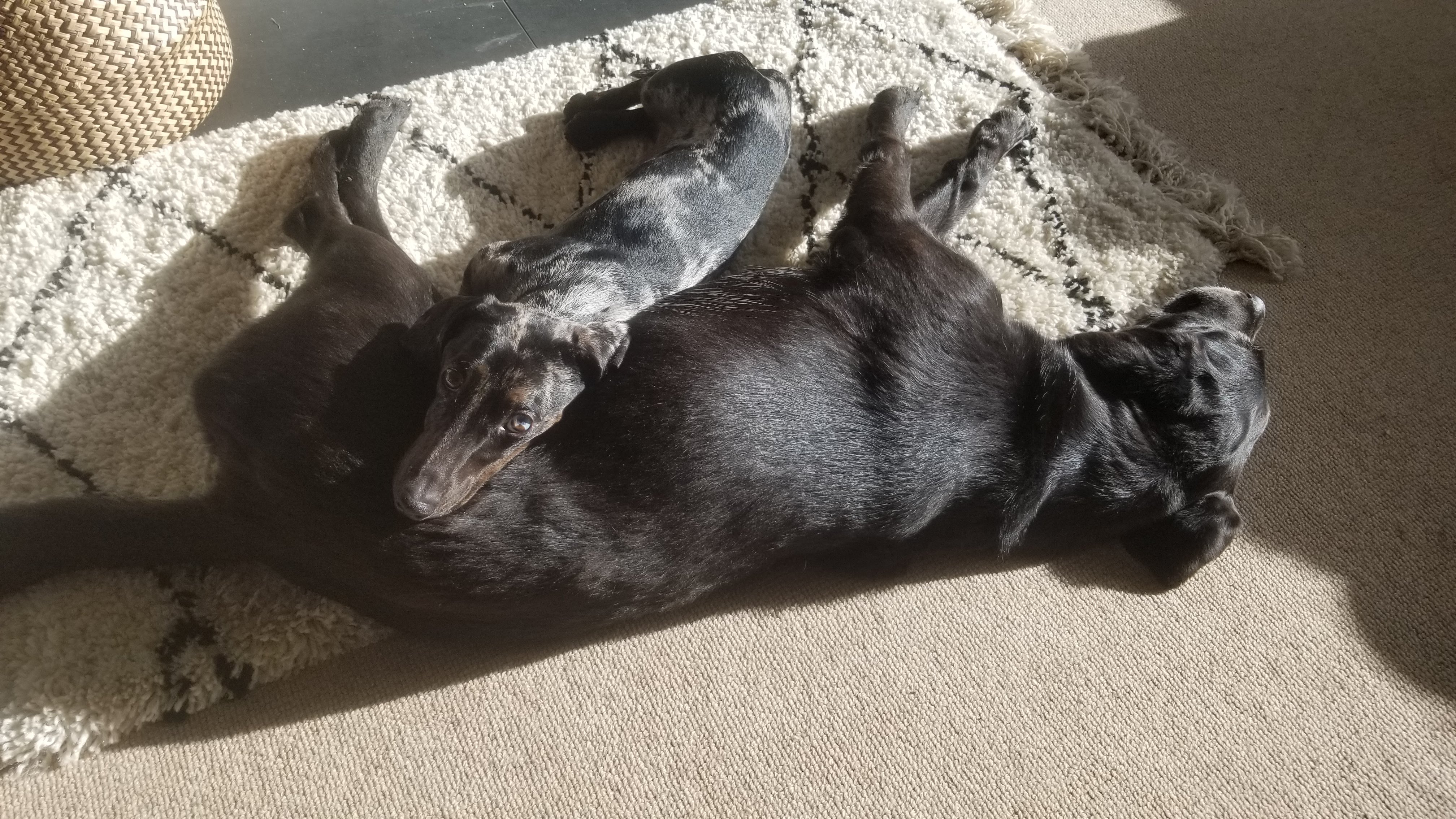 So, is there a trick in this tale of getting a Long Dog to lie low while away from home? If there is, we might have discovered it on our trip to Cambridge last weekend. The trick is to not be there. While we stayed in Cambridge, Badger was dropped in Bedford for a sleepover with long-time friends Jane and Stuart, and their lively Golden Lab Silas. It did not start well, as Badger launched an unprovoked attack on Silas. In Badger’s defence (no, really, he’s very bright and the teachers do not understand his needs), he did get roughed up Silas, who wanted to get rather too intimate with the Badger Boy. Silas is still ‘intact’. Badger (after his operation) is not. Silas seemed obsessed with this and constantly tried to lick the area that was lacking the very two things that Silas was boldly displaying between his hind legs. It was perhaps taking the…whatever.