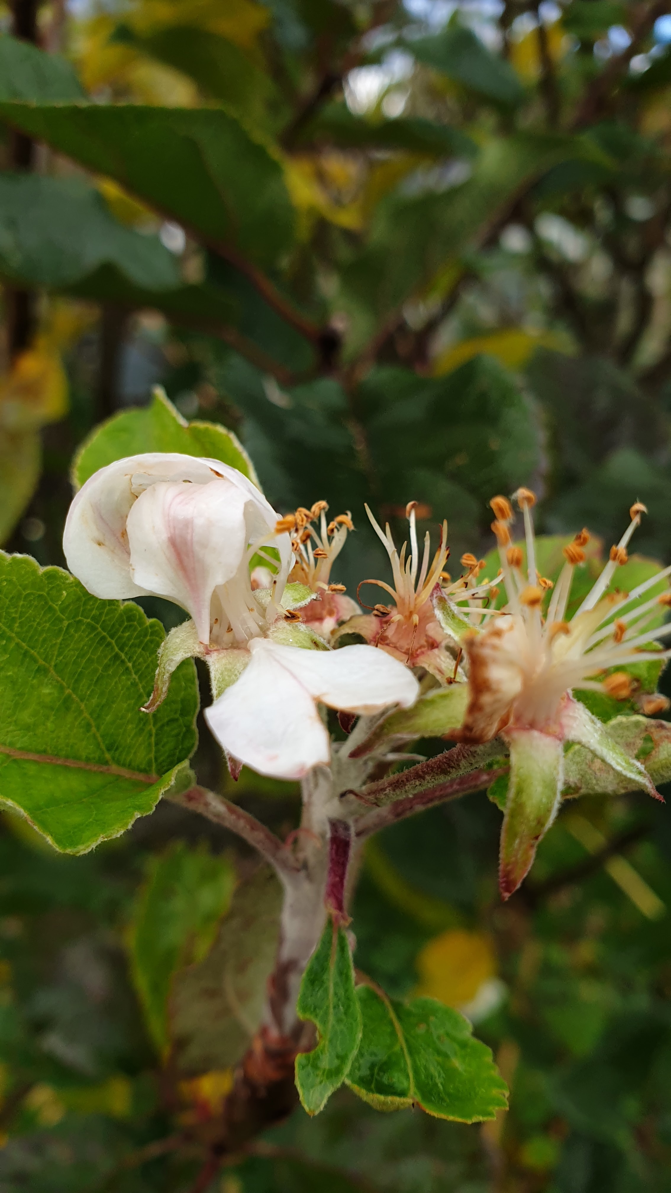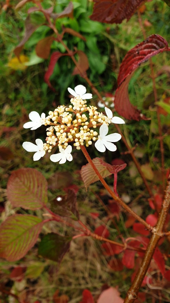 The Delph is not the only flower in the garden that has had a second coming. One of the apple trees, after a frankly poor crop this year, seems to be trying to make up for lost time, but like a school child asking to hand in their homework late, it is not going to get marked now. It’s too late for apples. Likewise, the viburnum mariesii has produce one or two late flowers, while its leaves turn a deep shade of red before dropping.