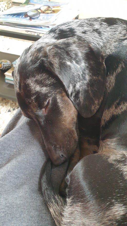 This Sniffy Dog is equally committed to discovering items of interest on your person too. If you chance to sit on the sofa, he is on your lap quick as a flash, checking your pockets for elicit substances. Be warned if you have a stray dog biscuit in your pocket: his long nose will find it. And he will frisk you anywhere you happen to be sitting, so be sure to shut the bathroom door firmly.