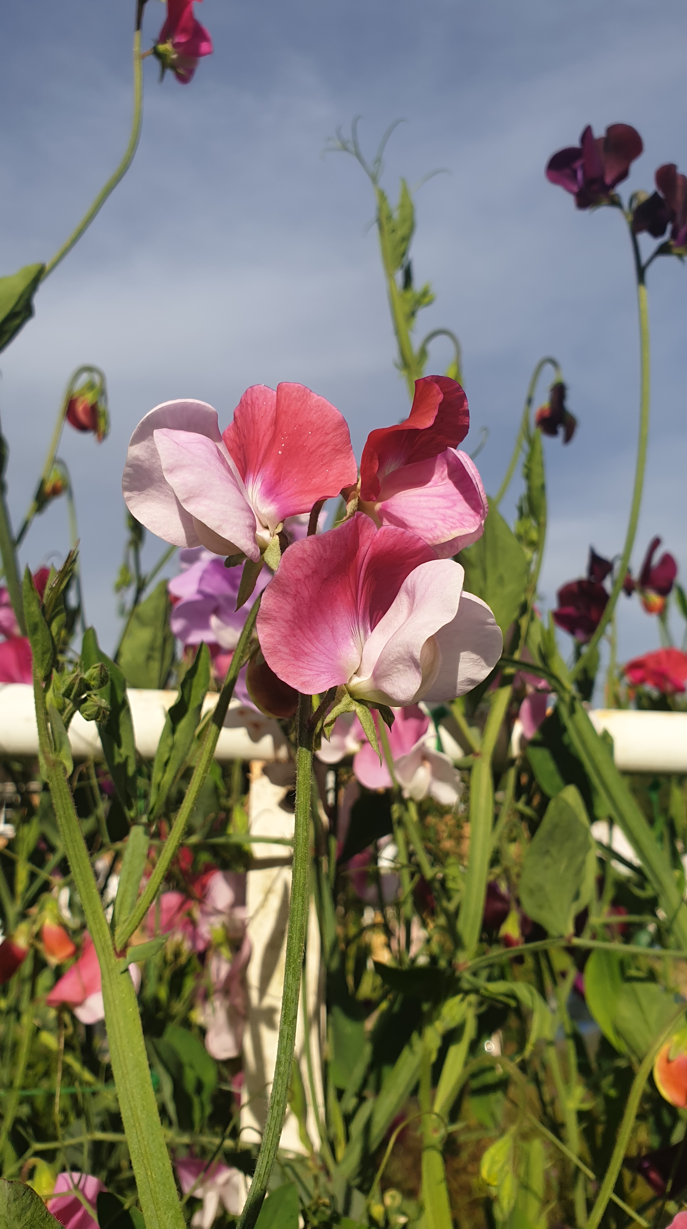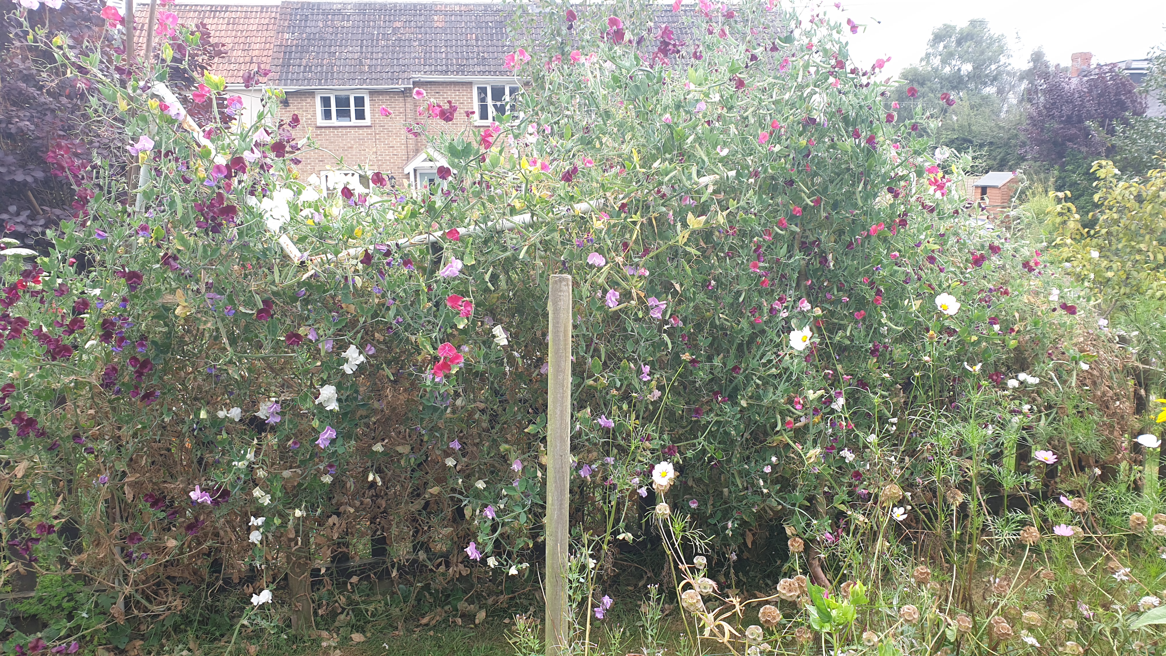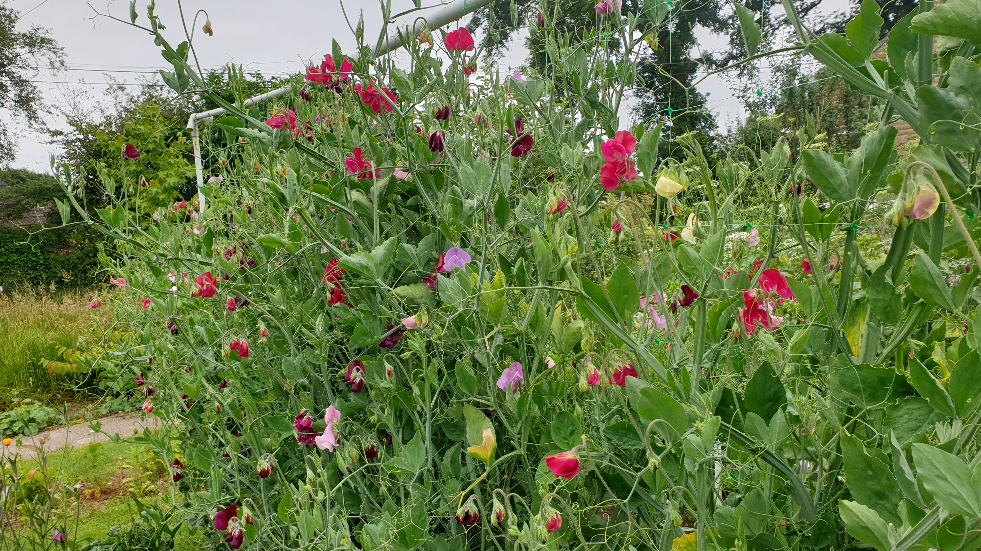 By March they were bursting out of their pots and storage containers and needed more room outside of the greenhouse. I used to think that Sweet Peas are not hardy, but they can survive anything down to -4C, so we took a low risk gamble and planted them out. Despite the wet weather, the first flower appeared on 5th May and by July they were in full bloom, so the job was a good ‘un.