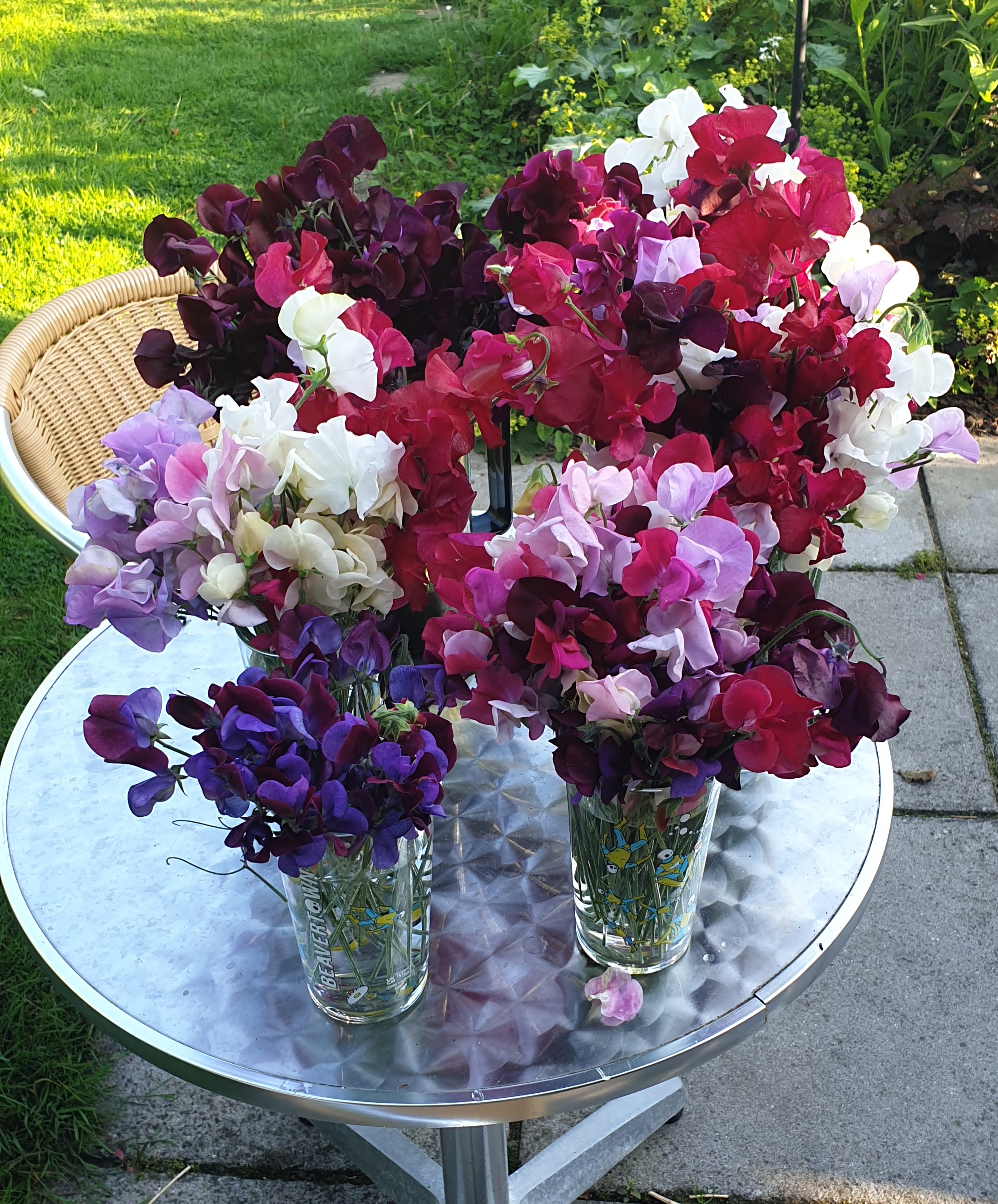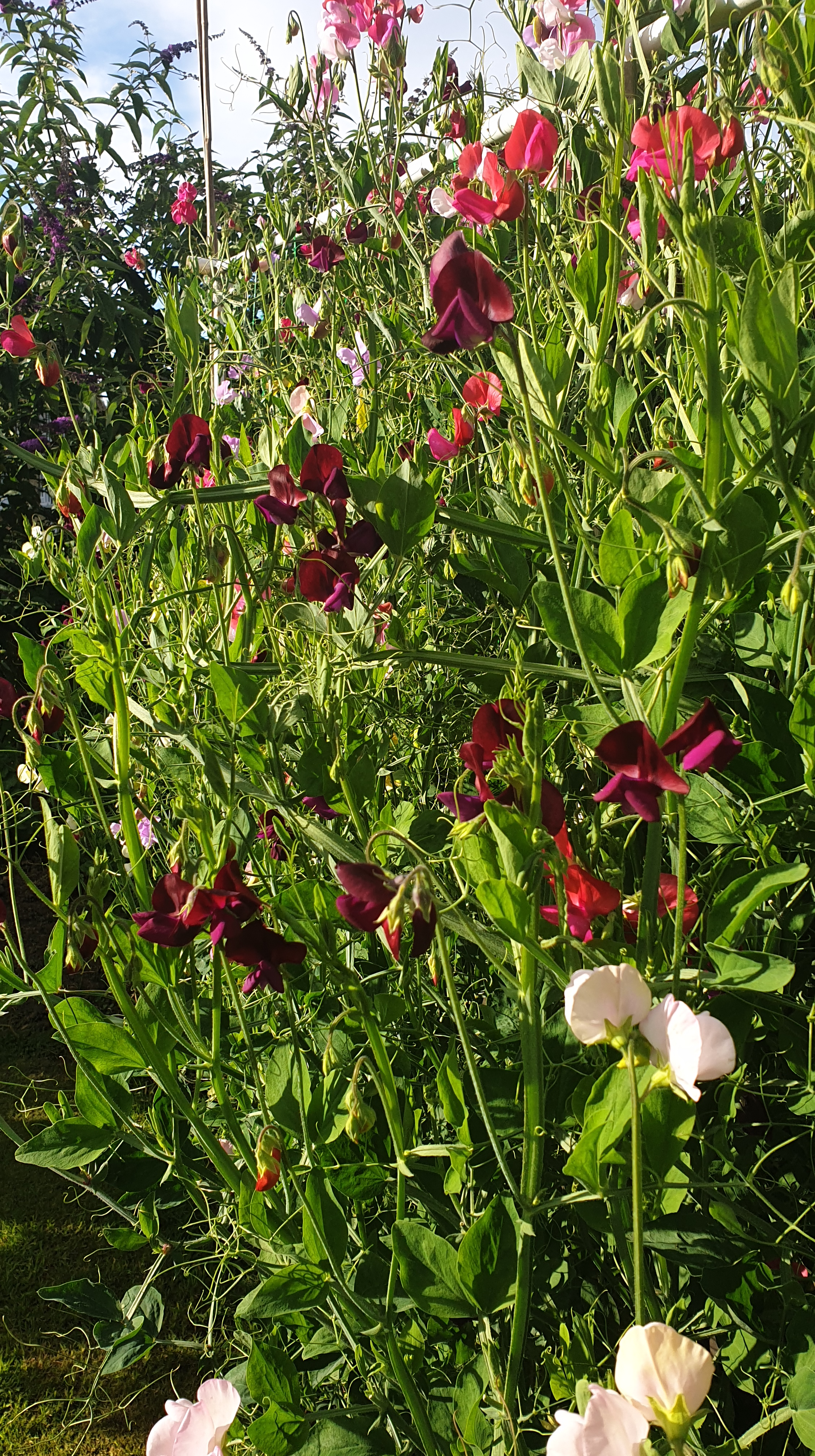 When I think of sweet peas, I think of my mother. Throughout the summer she would provide bunches to take away whenever we stayed and when, after she died, I started growing them myself it seemed apt that the first flower seemed always to appear on her birthday – 10th July.