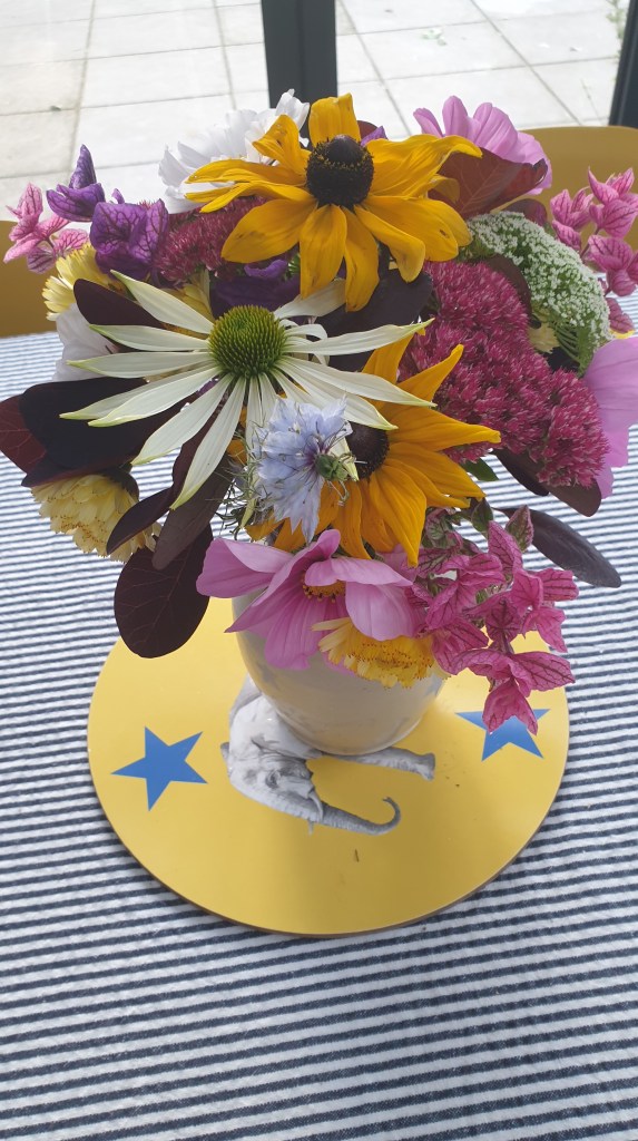 But there’s a good reason for the poor crop of veg, as the priority this year was flowers. These were an undoubted success, inasmuch as we got enough to bloom on the 13th July for THE WEDDING OF THE YEAR.