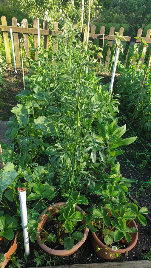 Malope Vulcan, Ammi Majus, Rudbeckia (Strawberries in pots)