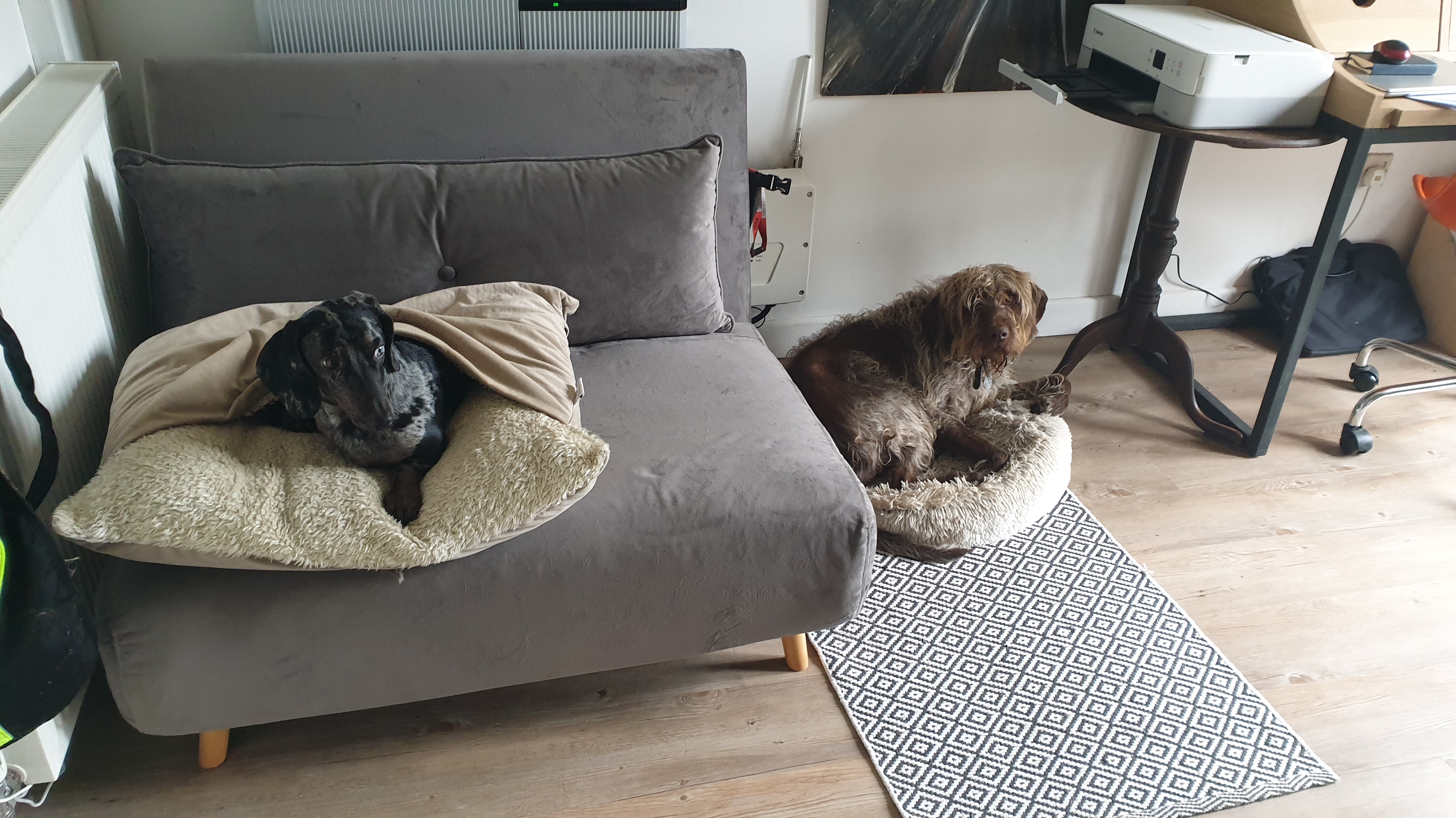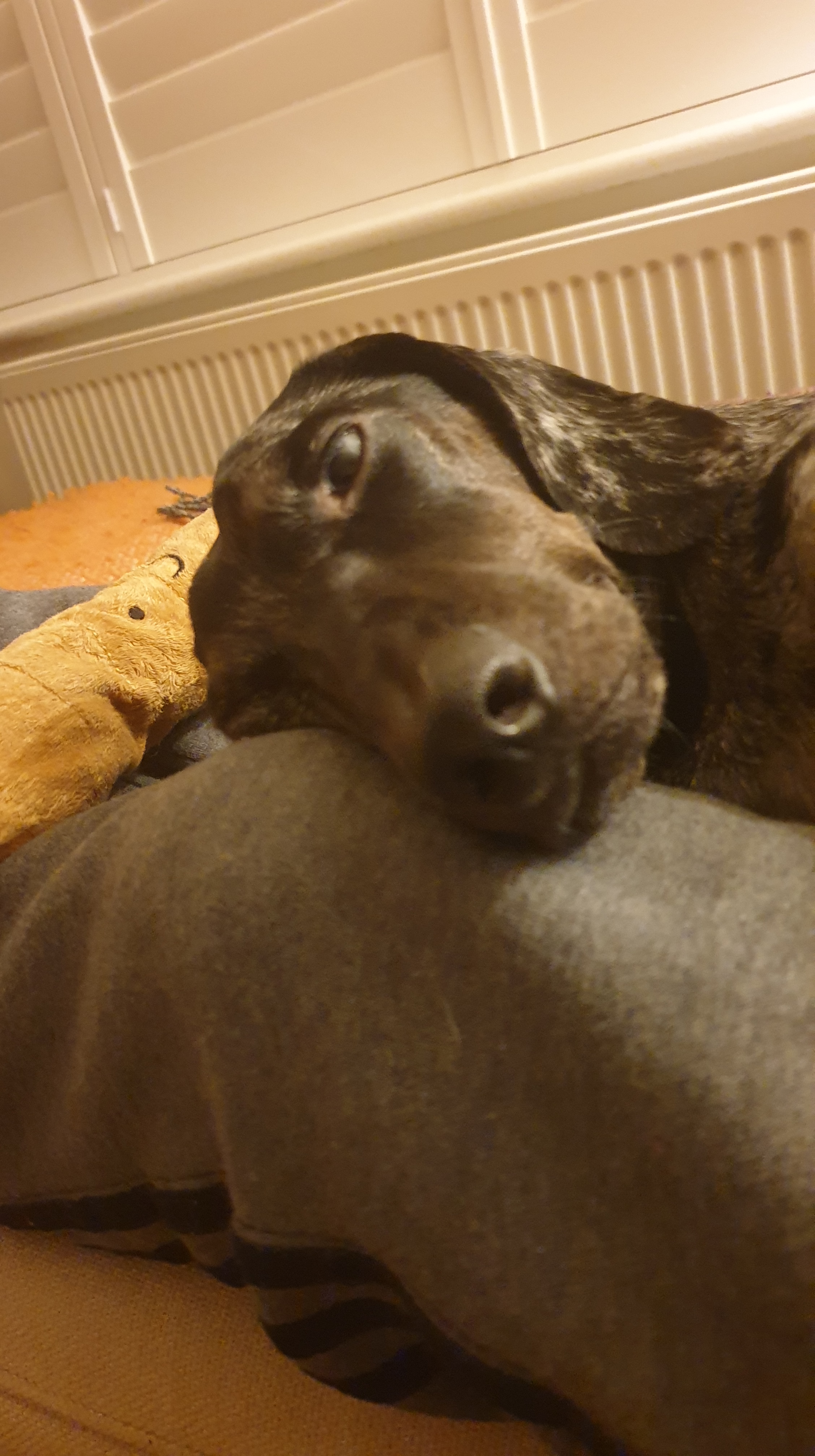 It started when we agreed to look after my brother’s dog, Bruno (a Vizler/Pointer cross) for ten days. On the first night, Badger’s ‘cousin’ opted to sleep in Badger’s small bed instead of his own, which meant he had to:
